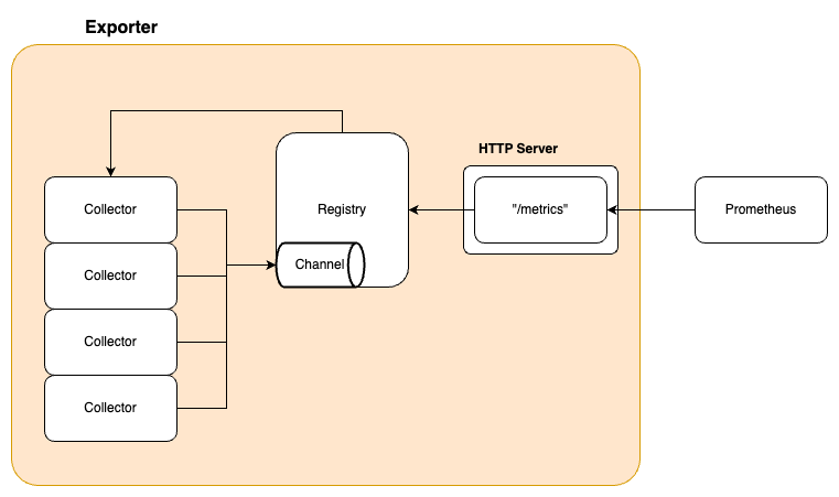 Prometheus exporter의 구조는 하나 이상의 registry와 여러 개의 collector로 구성되어 있습니다. Prometheus가 "/metrics"로 request를 보내게 되면 "/metrics" endpoint에 등록된 handler에 의해 registry를 통하여 metric을 수집하게 됩니다. registry는 각각의 collector로부터 metric을 수집하여 metric을 정렬 수행한 후 http body 형식으로 변환하여 response를 전달하는 구조로 되어 있습니다.