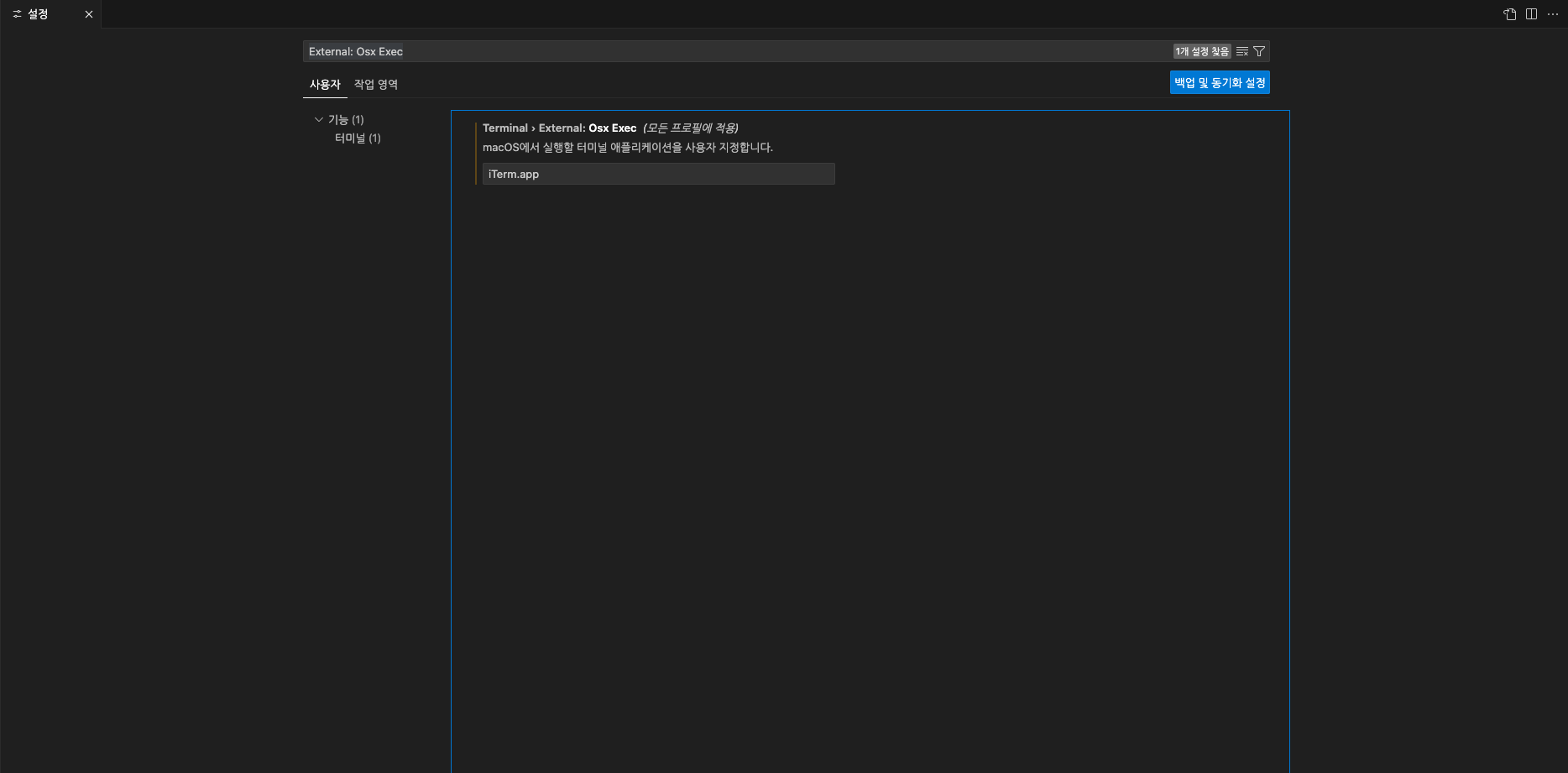 vscdoe와 iTerm2를 연동하기 위해 vscode를 실행하고 설정(cmd + ,)으로 들어가 "External: Osx Exec"를 검색하여 "iTerm.app"을 입력해주면 됩니다.