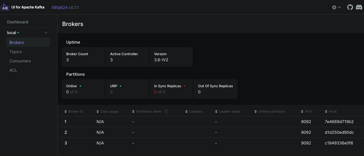 이번 실습에서는 클러스터 및 토픽 현황을 파악하기 쉽게 하기 위해 kafka-ui 컨테이너를 같이 동작하게 되어있습니다. kafka-ui를 통해 현재 카프카 클러스터가 정상적으로 동작하는지 브라우저에서 확인할 수 있습니다.