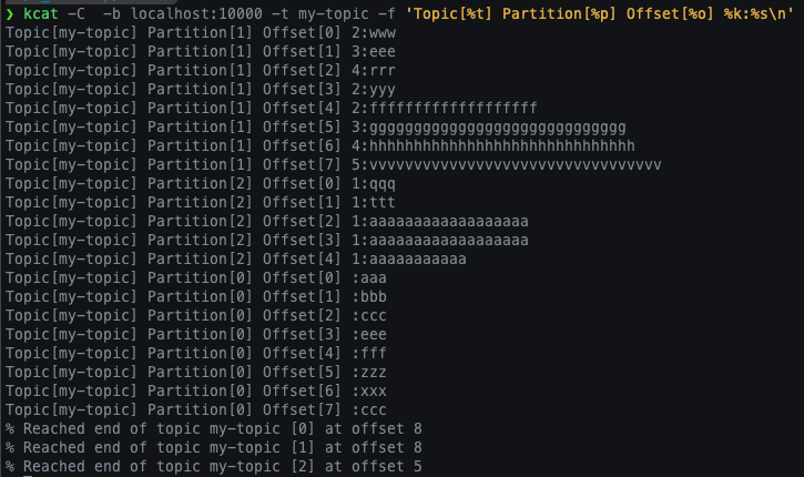 kcat -C -b localhost:10000 -t my-topic -f 'Topic[%t] Partition[%p] Offset[%o] %k:%s\n'