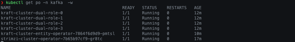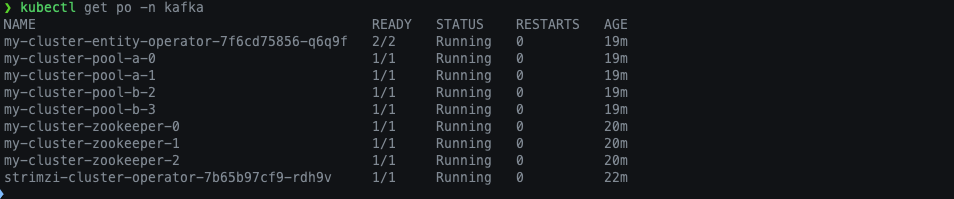 StrimziPodSet과 EntityOperator가 모두 정상적으로 배포가 되었고 이를 통해 다음과 같이 파드가 생성된 것을 확인할 수 있습니다.
