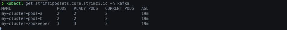 kafka 리소스를 생성하였다면 StrimziPodSet리소스가 생성됩니다. 기존에는 StatefulSet을 통하여 파드가 관리되었지만 현재는 Strimzi에서 정의한 StrimziPodSet으로 파드가 관리됩니다. 위와 같이 카프카 클러스터를 구축하였다면 다음과 같이 StrimziPodSet이 생성된 것을 확인할 수 있습니다.