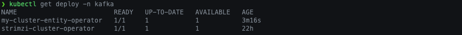 그리고 my-cluster 카프카 설정으로 Deployment 워크로드로 EntityOperator가 생성됩니다. EntityOperator는 TopicOperator와 UserOperator로 구성되며 Topic과 User를 생성 및 관리하는 역할을 수행합니다. 하나의 카프카 클러스터에 최대 하나의 EntityOperator가 생성될 수 있습니다.