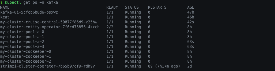 broker 1 at my-cluster-pool-a-1.my-cluster-kafka-brokers.kafka.svc:9092 (controller)