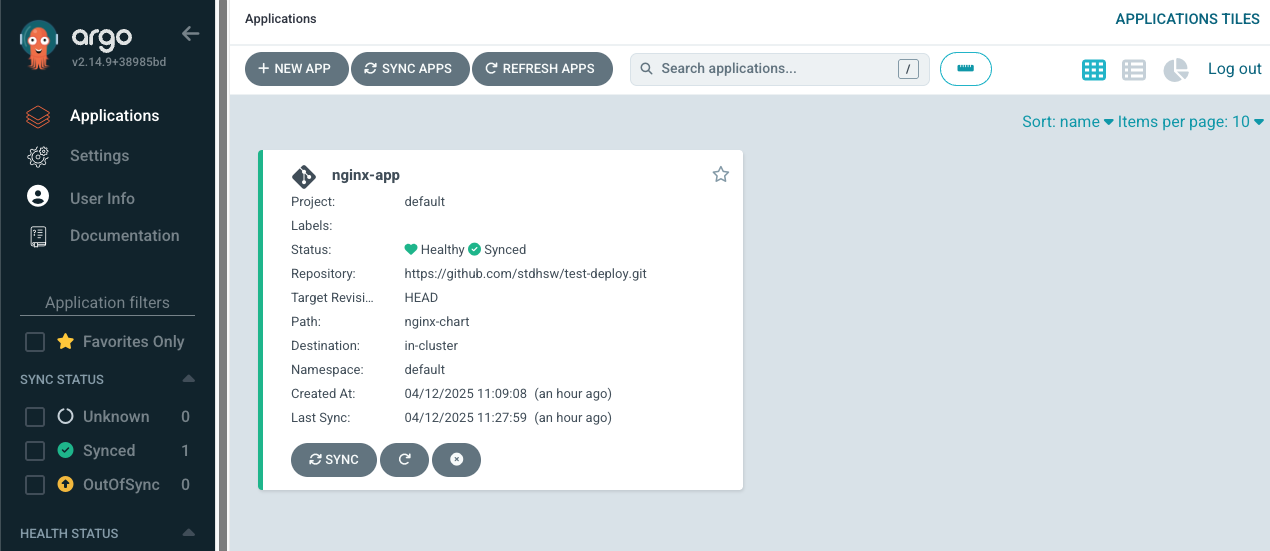 ArgoCD UI에서 정상적으로 Application이 배포되었는지 확인