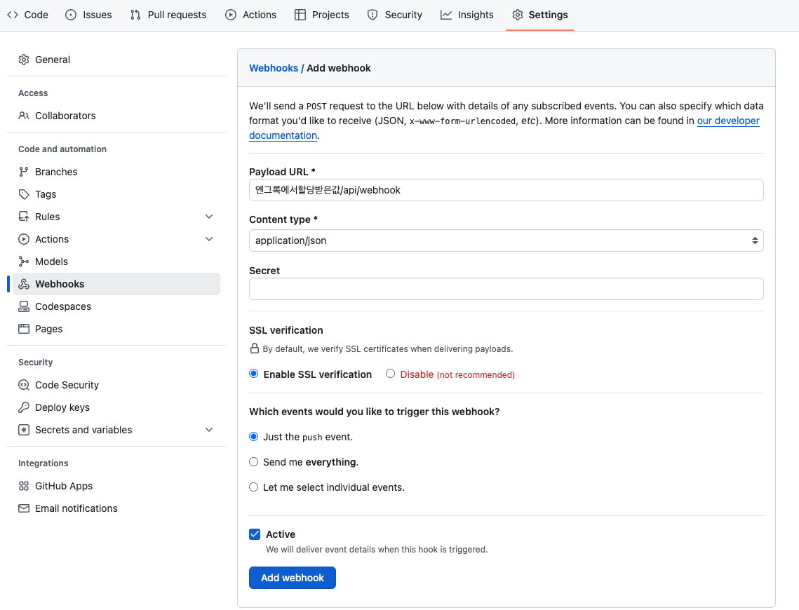우리는 Ngrok을 사용하여 로컬에서 실행 중인 ArgoCD 서버를 외부에서 접근할 수 있도록 설정하였으므로, Ngrok에서 제공하는 URL을 GitHub Webhook Event의 Payload URL로 설정합니다. 다음은 GitHub Webhook Event를 설정하는 방법입니다.