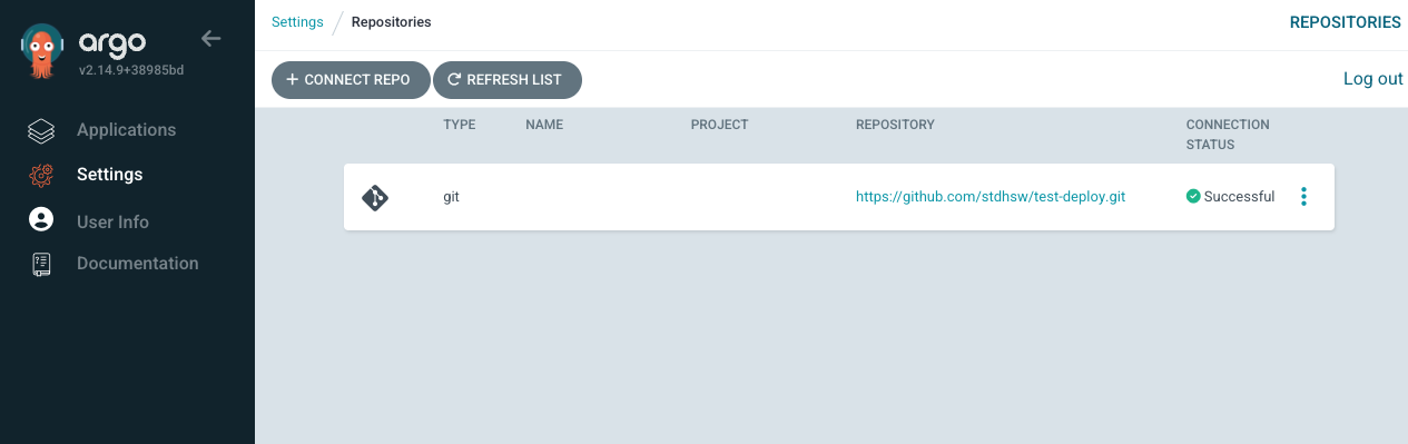 ArgoCD UI에서 정상적으로 Repo가 등록되었는지 확인