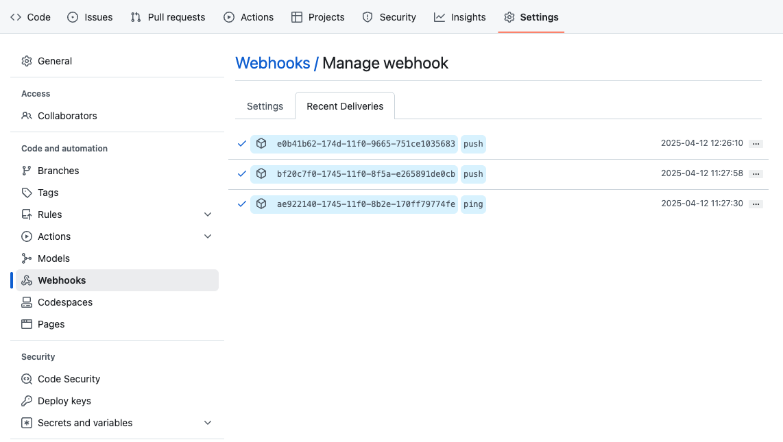 Github repo -> Settings -> Webhooks -> 웹훅선택 -> Recent Deliveries 선택