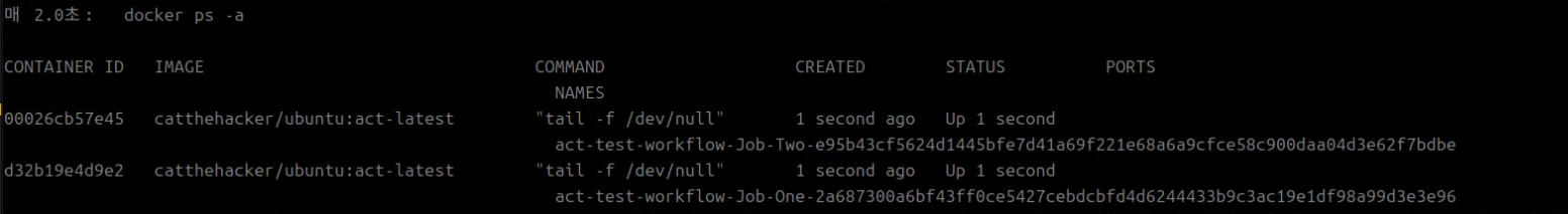 위에서 소개한 방법으로 act를 이용해 워크플로우를 실행하면, 각 job이 Docker 컨테이너로 실행되는 것을 확인할 수 있습니다. 예를 들어 두 개의 job이 정의된 워크플로우를 실행했다면, act는 각각의 job을 개별 Docker 컨테이너로 실행합니다.