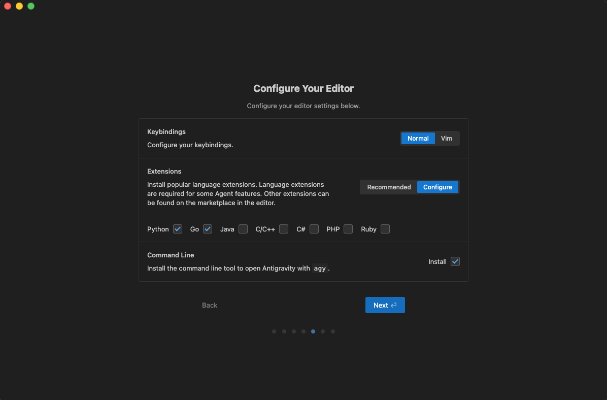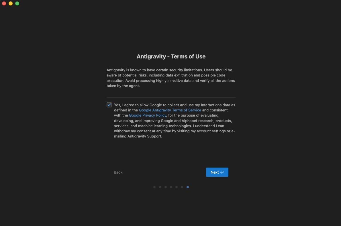 다운로드가 완료되면 Antigravity를 Application에 등록하여 실행하면 위와과 같이 나오며 NEXT 버튼을 눌러 진행합니다.