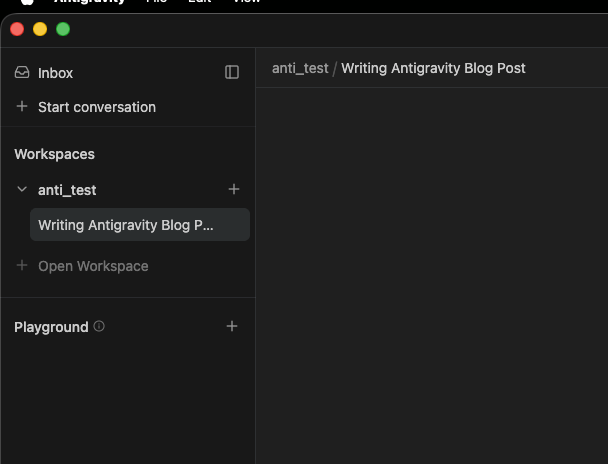 지금까지의 과정을 통해 Antigravity설치를 완료하였습니다. anti_test라는 디렉토리를 생성 후 해당 디렉토리를 Open 하면 다음과 같은 화면으로 구성됩니다.