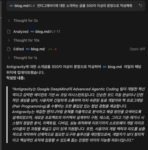 간단하게 테스트를 진행하기 위해 이번 블로그의 내용을 작성해 봤습니다. 이렇게 간단한 내용을 작성 후 4번째 라인을 블록하여 선택해 주고 cmd + L을 누르면 AI 채팅창에 해당 라인을 지정할 수 있습니다. 그리고 다음과 같이 Antigravity에 대한 간략한 소개글을 작성해 달라고 부탁을 하면 다음과 같이 해당 파일에 내용을 작성해 줍니다.