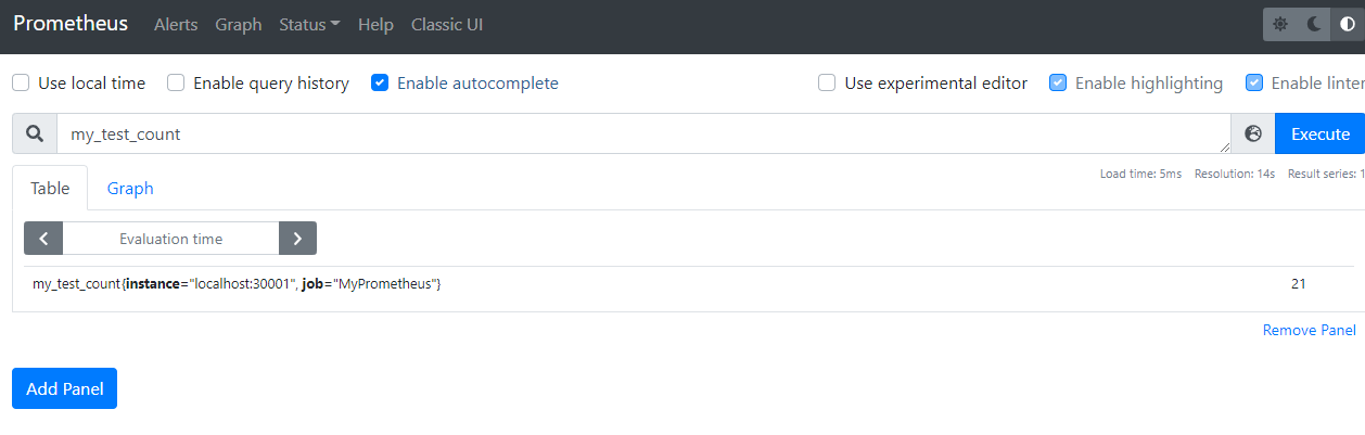 promauto.NewCounter를 통하여 카운터를 생성하고 카운터의 이름을 my_test_count로 만들었다. 카운터는 2초에 한 번씩 MyCounter.Inc()를 통하여 1씩 증가하고 있다. MyCounter.Add()를 이용하면 1 이상의 값을 증가시킬 수도 있다.