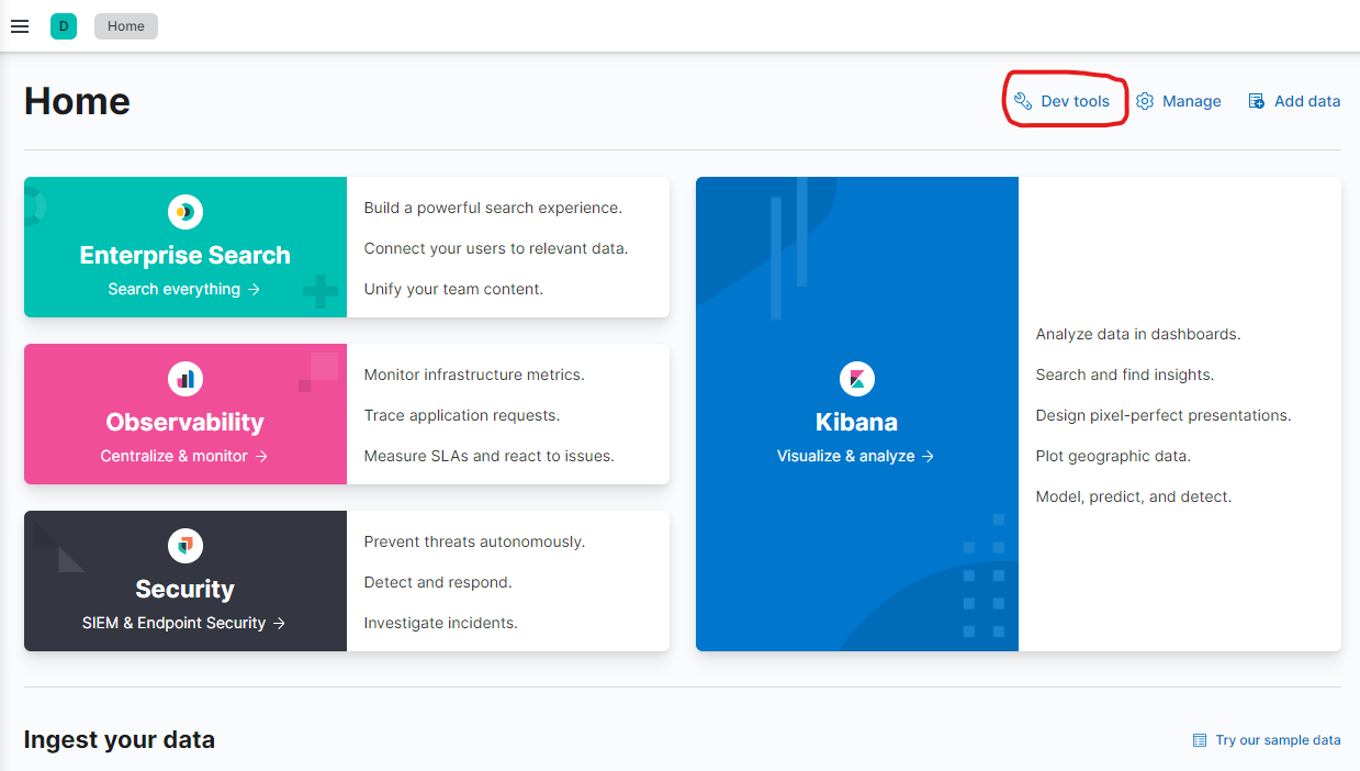 Elasticsearch와 kibana가 실행되고 있다면 http://localhost:5601로 접속하여 Dev tools를 선택하여 들어갑니다.