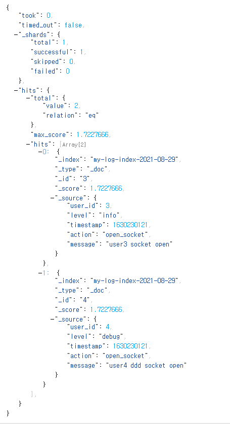 | body | {"index": {"_index": "my-log-index-2021-08-29", "_id": 1}} {"user_id":1, "level":"info", "timestamp": 1630230119, "action": "open_file", "message": "user1 aaa file open"} {"index": {"_index": "my-log-index-2021-08-29", "_id": 2}} {"user_id":2, "level":"debug", "timestamp": 1630230120, "action": "open_file", "message": "user2 bbb file open"} {"index": {"_index": "my-log-index-2021-08-29", "_id": 3}} {"user_id":3, "level":"info", "timestamp": 1630230121, "action": "open_socket", "message": "user3 socket open"} {"index": {"_index": "my-log-index-2021-08-29", "_id": 4}} {"user_id":4, "level":"debug", "timestamp": 1630230121, "action": "open_socket", "message": "user4 ddd socket open"} {"index": {"_index": "my-log-index-2021-08-29", "_id": 5}} {"user_id":5, "level":"info", "timestamp": 1630230122, "action": "open_file", "message": "user5 ccc file open"} {"index": {"_index": "my-log-index-2021-08-29", "_id": 6}} {"user_id":6, "level":"info", "timestamp": 1630230123, "action": "close_file", "message": "user6 aaa close open"} {"index": {"_index": "my-log-index-2021-08-29", "_id": 7}} {"user_id":7, "level":"info", "timestamp": 1630230124, "action": "close_socket", "message": "user7 ccc close socket"} {"index": {"_index": "my-log-index-2021-08-29", "_id": 8}} {"user_id":8, "level":"debug", "timestamp": 1630230125, "action": "open_file", "message": "user8 aaa file open"} {"index": {"_index": "my-log-index-2021-08-29", "_id": 9}} {"user_id":9, "level":"info", "timestamp": 1630230126, "action": "open_file", "message": "user9 bbb file open"} {"index": {"_index": "my-log-index-2021-08-29", "_id": 10}} {"user_id":10, "level":"info", "timestamp": 1630230127, "action": "open_file", "message": "user10 aaa file open"} {"index": {"_index": "my-log-index-2021-08-29", "_id": 11}} {"user_id":11, "level":"warn", "timestamp": 1630230128, "action": "open_file", "message": "user11 bbb file open"} {"index": {"_index": "my-log-index-2021-08-29", "_id": 12}} {"user_id":12, "level":"info", "timestamp": 1630230128, "action": "open_file", "message": "user12 aaa file open"} {"index": {"_index": "my-log-index-2021-08-29", "_id": 13}} {"user_id":13, "level":"info", "timestamp": 1630230129, "action": "open_file", "message": "user13 bbb file open"} |