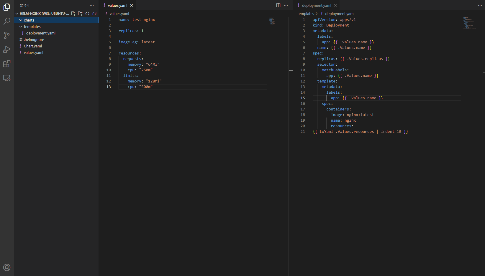 helm-nginx 디렉토리로 이동하여 helm chart를 간단하게 구성도록합니다. 이번 실습에서는 불필요한 부분은 제거하고 values.yaml파일과 templates/deployment.yaml만 작업하였습니다.