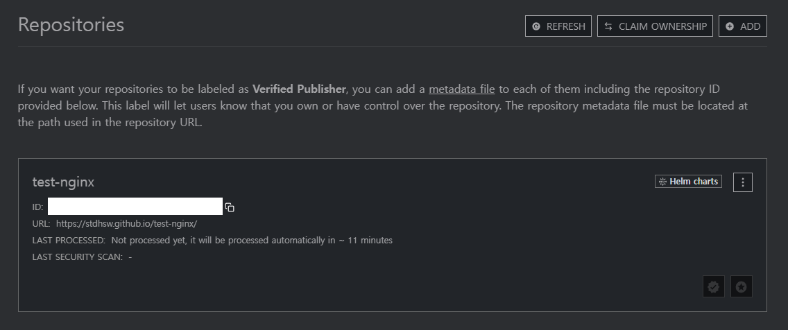 Repo 설정이 완료되었다면 일정 시간 간격(약 30분)으로 Repo 스캔을 하게 됩니다. 스캔이 완료되면 해당 Repo를 통하여 helm을 이용해 배포할 수 있습니다.