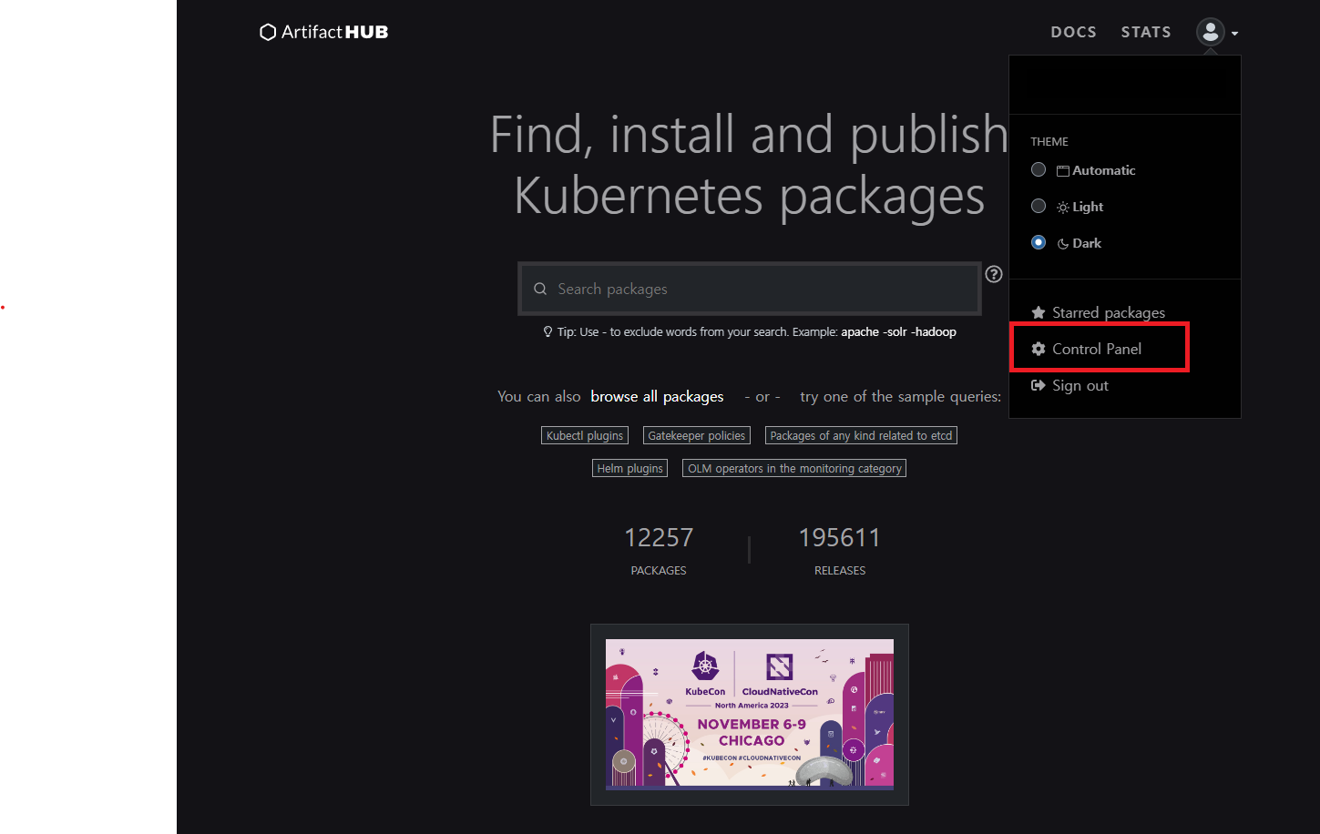 Artifact Hub에 접속하여 로그인합니다.