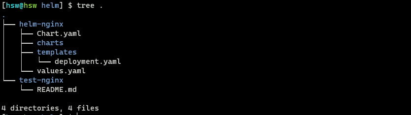 helm-nginx 디렉토리는 실제 helm chart를 작성하였고 test-nginx는 방금 생성한 github repo를 clone 한 디렉토리입니다. helm-nginx 디렉토리에서 작성된 helm chart를 test-nginx에 package 하여 github에 push를 할 예정입니다.
