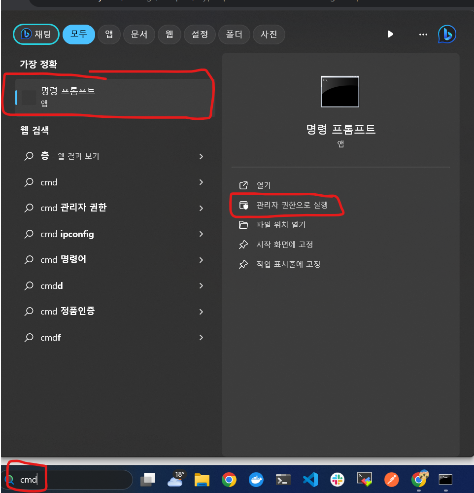 검색 창에 cmd를 검색하게 되면 "명령 프롬프트"라는 앱이 검색됩니다. 여기서 관리자 권한으로 실행하여 "명령 프롬프트" 앱을 열어줍니다.