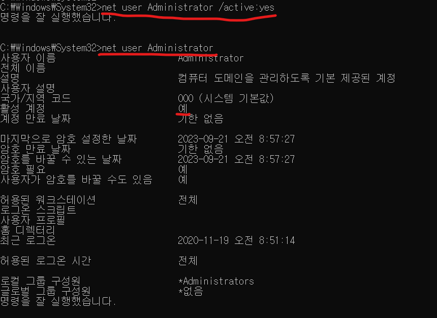명령어를 실행하고 다시 "net user Administrator"를 통해 상태 값을 확인하면 "활성 계정" 옵션의 값이 "예"로 변경된 것을 확인할 수 있습니다.
