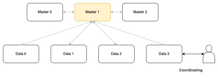 코디네이팅 노드는 요청을 받아서 해당 요청을 처리하는 역할을 수행합니다. 코디네이팅 노드는 별도로 설정하는 것이 아닌 요청을 받은 노드를 코디네이팅 노드라고 합니다. 그렇기 때문에 일반적으로 데이터 노드에서 코디네이팅 역할을 같이 수행하도록 하지만 대규모 클러스터에서는 데이터를 저장하지 않고 요청만 받아서 처리하는 코디네이팅 노드를 별도로 구성하여 요청에 대한 부하를 분리하기도 합니다.