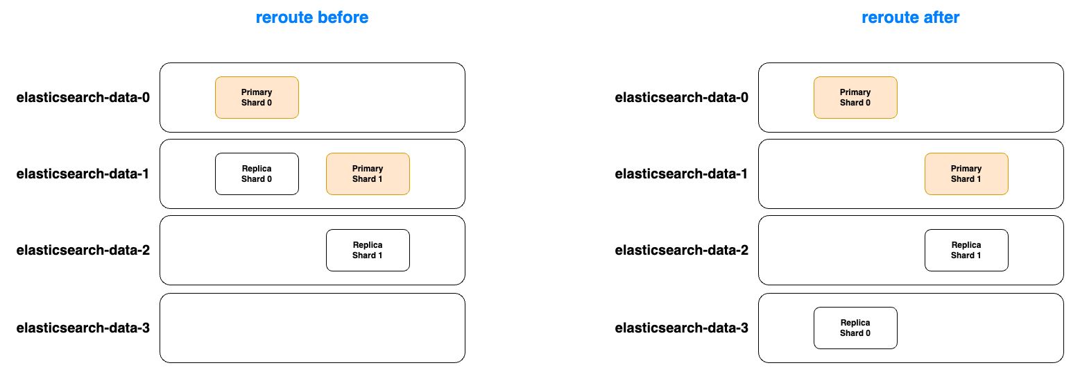 request를 수행하기 전과 수행한 후의 샤드의 배치 모습을 아래와 같이 그림으로 그렸습니다. 여기서 중요한 것은 "Shard 0"의 Primary shard와 Replica shard가 고가용성(HA)을 유지하기 위해서 같은 노드에 존재하게 하면 안 됩니다.